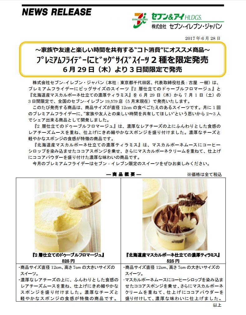 6/30月末の金曜日は月に1回のプレミアムフライデー。その企画として「プレミアムフライデーにビッグサイズスイーツ2種を限定発売」 6 月 29 日(木)から 7 月 1 日(土)の 3 日間限定とセブンイレブンのホームページでニュースリリース(pdf有)されている。直径12センチのビッグサイズのスイーツが税込525円は安い!と思い早速買いに行くも、私が行ったセブンイレブンは「注文していない。」「売切れました。」と人によって返事が違う。(怒) (6/29)ここの店は「前回」も他の商品を買いに行った際、「これは発注していない。」と言われ、「〇〇のセブンイレブンなら置いている可能性がある。」と・・・。商売っ気がないというか、店舗のやる気のなさが目について仕方がない。全国販売(5月末現在の19,579店)なのに、一体どういう事!!こんな事ってありえるのか・・・。都会では考えられないです。最近できた店ならともかく、そうじゃなければ対象店。そして翌日(6/30)、違うセブンイレブンへ行くも、店員は何のこと?といった反応で、「それはセブンイレブンの商品ですか?」と言われる始末。もはや社員に周知されていない状態。(バイトかもしれないが・・・)値段が税込525円という消費税5%の時の値段設定というのもあり、ガセネタか?と不安になってサイトで再確認するが、やはり2017年6/28付のニュースリリース。本当にこんなことがあり得るなんてという感じで狐につままれたみたいです。これはもう、諦めるか、執念でも手に入れるか・・・のどちらかだが、最終日の7/1は、友人が会社帰りに「ここはいつもよく売れている店」とイチ押しする店に寄ってくれたのだが、無かったらしい。友人曰く「中部だし、中途半端な静岡はないんじゃない?」と・・・。 確かに、無駄足を踏んでばかり。代わりといっては何だが、「カマンベールチーズスフレ」を買って帰る。 これは前回も購入したことがあり、手ごろな値段の割に美味しかったのでリピ。フワシュワッとした軽い食感。それでいてしっとり。チーズの存在感もあり。 チーズ中フランス産のカマンベールチーズが占める割合13%が売り。昨年は北海道産のカマンベールチーズだったようですが・・・製造者:山崎製パン というのに驚きました。 やるね!ヤマザキって感じです。にしてもチーケ好きの私、「2層仕立てのドューブルフロマージュ」食べてみたかったな・・・。