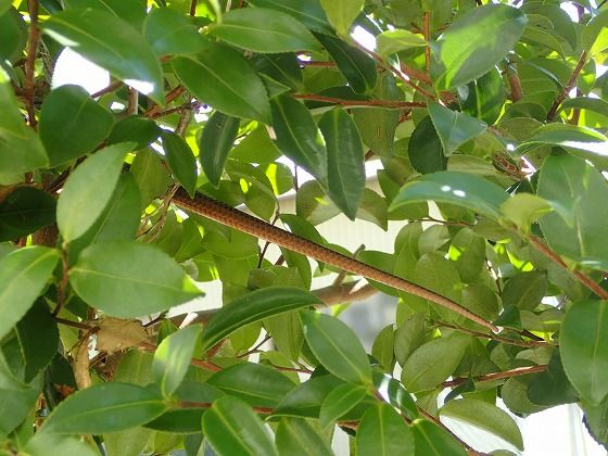庭先でガサガサと音がするので、キョロキョロしていたら、枝にカモフラージュした何かが 「トカゲか~。」と思ったが、「ん?妙に長すぎるぞっ?」よ~く観察。ヘビ 前にあったシマヘビかなぁ~。(当blog参照:縁起物)いずれにせよ、攻撃もしてこないし、逆に隠れるほどの臆病者のシマヘビちゃん。我が家の守り神かな そういえば通勤時にシマヘビが道のど真ん中で死んでいるのを見かけた。 まるで生きてるように見えるが、全く動かない。このままだと車にひかれるので、端に寄せてあげたいが怖くてムリ~後ろ髪を引かれる思いだったが、そのまま職場に向かった。この辺りはシマヘビが多いのかなそして、以前 通勤時に出会った鴨の親子。(当blog参照:激辛麻婆豆腐と事故?) 通勤時にまた出会いました。 1ヵ月もしないうちにめっちゃ大きく育ってました。子供たちは3羽揃って整列。既に産毛もないように見え、体の大きさが違うだけで、ほぼ大人と同じ。動物の成長は早いなぁ~。関西ではありえない生き物との遭遇が、富士市では当たり前。自然が沢山ある証拠ですね。