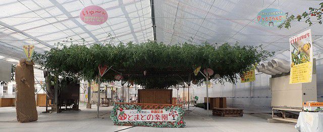 天井に棚を作ってどんどん伸ばしトマト自身の重みで垂れた状態で成ってる。
