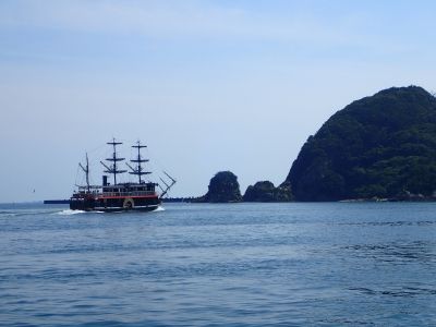 遠くに見える赤根島の側を黒船遊覧船が下田港内めぐりをしていました。