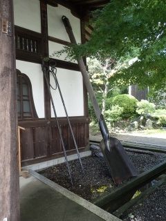 御真殿の階段下には天狗のゲタに火箸?とスコップも。