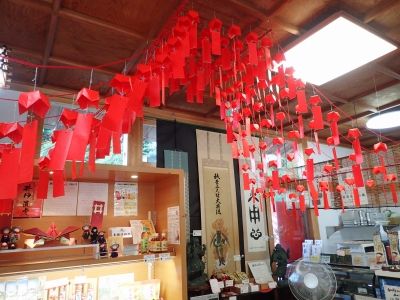 境内入口近くのお土産屋さんでは紙で作った風鈴で「赤富士」が飾られていました。