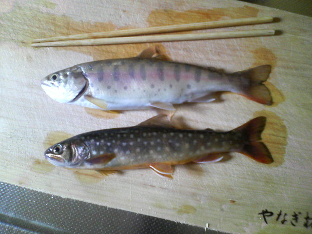 今日も行ってきました渓流釣り! もうね昨日の反省と悔しい思いを胸にフライを買い足し!んでもって朝4時に起きましたよw 気合入りすぎかのぅwそして目的地到着!何回か探っていたら!でて来ました !岩魚!そして立て続けに山女! サイズは山女20cm岩魚18cmでした用事を済まして午後5時再び決戦の場へ! 今度は2匹とも山女!気になるサイズは上19cm下22cmでしたいやぁ渓流って奥が深いですまたドライブがてらどこかの川で竿を出してるかもしれません