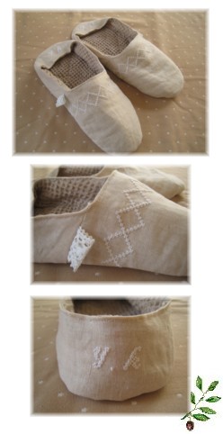 表地はリネン。クロスステッチで甲の部分に模様を入れてみました。