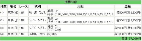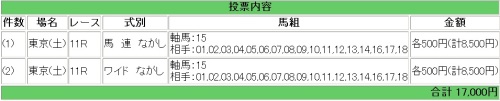 ロードカナロア10番。後入れの偶数番で良いんじゃない?ダイワマッジョーレ17番。前走15番だったし良いんじゃない?オッズ次第で16番ダノンシャークを絡めた3連複も買ってみる。本線は10-17ワイド。