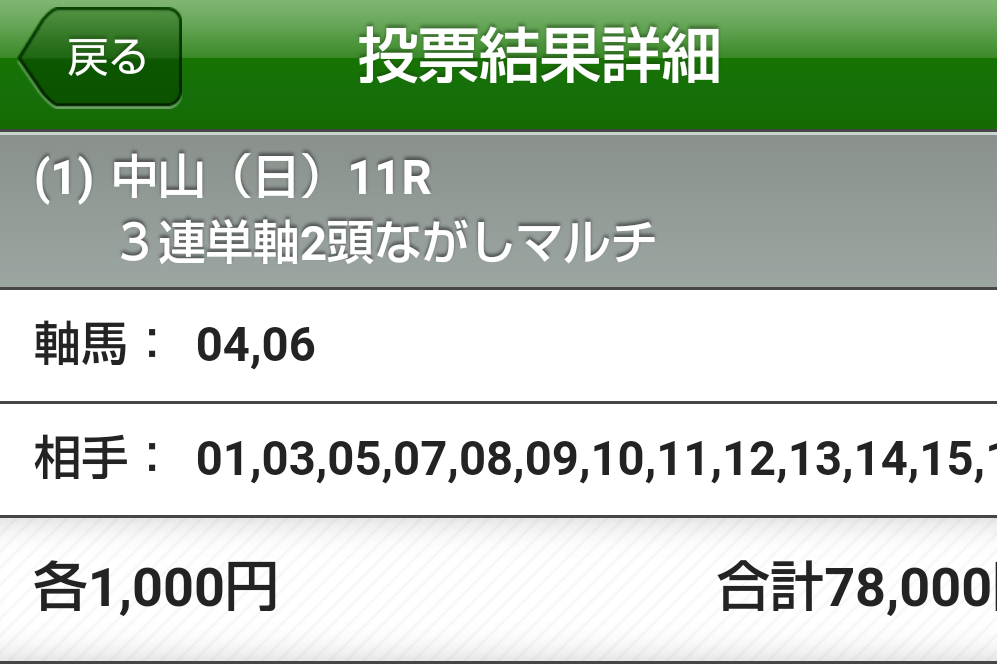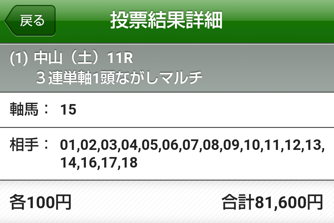 3連単総流しマルチの予定。母がアンライバルド(1A 9~15F)全妹です。最低人気の馬が母がソルテ半妹でそれなりに見所が有るのでちょっと買い足す予定。ディーマジェスティは日本向きではないですが、たまに3Bを輩出してます。あとは1番人気と武にいんぐりもんぐり。