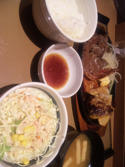 ステーキ・ベーコン・チキン・ハンバーグ・ポテトでライスおかわり自由。980円のところ100円引き。