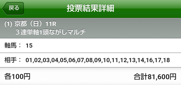 フローテーションの菊って今年と同日だったんですね。2ちゃんねる競馬板の「出会いはフローテーション♪」スレでの華々しいデビューから17年経ちましたwエリキングは3B中長距離で、皐月賞・ダービーても買ってました。京都実績が有り重も大丈夫レッドバンデは3B長距離。負け→勝ち→負け→勝ち→負けで今回は勝ちの番か。ただし京都経験と騎手の経験がライトトラックは3B中距離。京都外回り2戦2勝が魅力ヤマニンブークリエも3B中距離。京都経験無いのがね。今回控除率が全て20%と言う事で、一番恩恵の有る3連単で買います。エリキングから3連単総流しマルチエリキング・レッドバンデ2頭軸3連単総流しマルチエリキング・レッドバンデ・ライトトラック3連単BOXヤマニンブークリエ含め4頭BOX1万倍の馬券9000円買ったらさすがにオッズ下がったwふろーすれ1(久々)