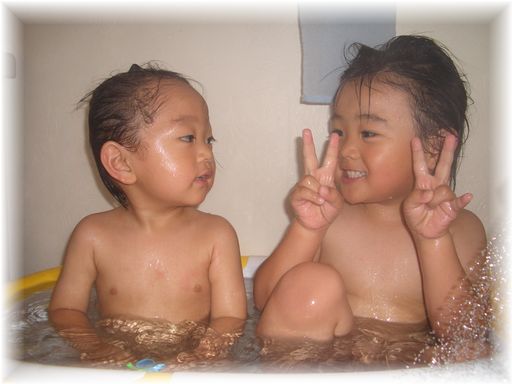 風邪をひいてしまってまたまたひさびさの更新です今回風邪をひいたのは子供たちじゃなくてアタシ金曜の夜に、子供たちをお風呂に入れた後ものすごい寒くて「あ~、もう秋なんだなぁ~、やっぱ夜は肌寒い!!」なんて勝手に思い、子供たちに長袖パジャマ着せてたら気づいた時には子供たちが汗だくにやっと異変に気づき、熱を測ったら38度後半寝ればよくなると思ってとりあえず寝たけど次の日も下がらず。。。結局土日は39度付近を上がったり下がったりの繰り返しでした 昨日やっと病院に行き(遅いよね)扁桃腺がものすごく腫れてるからそこからの高熱であることが判明。ほっとしました~。。。 とゆうのも丁度、今月の頭にチビ君の麻疹の予防接種に行ったの。その時に、なんらかの形でウイルスに感染したかも~って思って。熱も高いし、オマケに口にできものまで湿疹はなかったけど、麻疹だったらどうしよ~ってハラハラしてたよ溶連菌の検査も白だったしよかったぁ~今日は、やっぱり喉が痛くてろくに食べたり飲んだりはできないけど熱はさがってスッキリです でも日曜日に幼稚園の祖父母参観があったのに行けなかったのは残念だったなぁ 長々と書いてしまったお詫びと言ってはなんですが、アニ君&チビ君のセクシーショットをどうぞ はい!!どーーーん!!!初めて顔がはっきり映った写真なのに全裸(笑)掲載ギリギリ~大サービスです次回はきちんとお洋服着させますね