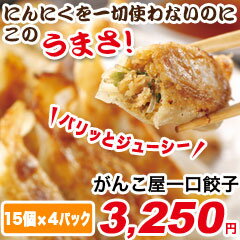 【送料無料】にんにくを一切使わないのにこのうまさ!がんこ屋の一口餃子。がんこ屋一口餃子<内容量>225g(15g×15個)×4パック、タレ5cc×4パック<原材料>【あん】鶏肉、春雨、ねぎ、ニラ、酒、醤油、オイスターソース、ゴマ油、砂糖、食塩、胡椒【皮】小麦粉、米粉 (タレ)穀物酢、醤油、鰹節(原材料の一部に小麦、大豆を含む)<賞味期限>冷凍180日<アレルゲン>小麦・大豆旨さの秘密は春雨!新潟生まれの“がんこ屋”がお届けする、国産野菜にこだわったやさしい餃子です。にんにくを使用していないので、食べた後の匂いが気になる方にもおすすめです!冷たいビールにこだわり餃子はいかがですか?さらに詳しい情報はコチラ≫[PR]餃子通販の館