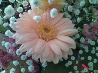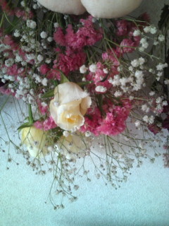 先日、離任式でもらった花束のアップです。ガーベラ。ミンミの好きな花です。カーネーション。縁が赤紫で変わってますよね。 バラより、カスミソウにピントが合ってしまった・・・スターチス。ドライフラワーになるから重宝します。