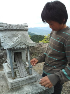 御嶽山に家族で登りました。岩山展望台に小さな祠があり、その棒にカズはスパイクのゴムを結びつけていました。必勝祈願?岩場を下るとき、あぶなかっしいからと、カズが後からついてきてくれました。なんやかんや減らず口叩いても、優しいのですよね。そこから山道を下り、法楽寺跡に出ました。明治の廃仏毀釈で廃寺になったらしい。石仏はその名残のようだ。ここを右に歩いて、小さな峠を越えた。もう登りはないかと思ってたのに、、、峠を過ぎれば、ゴルフ場に連絡する車道を下るだけ。広い車道だけど、あまり車が通らないので、カズは車道の真ん中で寝ころんで、一度こうしてみたかったんだと言っていた。写そうとしたら、起き上がってしまったけど、、、また、車道沿いに大きな花が咲いてる樹があって、一輪ひらひらと落下傘のように落ちてきた。それをミンミが走っていってキャッチ!「毒があるみたいな花!」とミンミが気持ち悪がる。黒い斑点があるからかな?色はきれいな水色なのにね。下って同じような花を見かけたけど、それには斑点が見えなかった。何という花なんだろう?里まで下り、車を停めておいたかんな川温泉、白寿の湯に入りました。胡蝶蘭のシルクフラワーが飾ってありましたね。また、湯の花が一杯床や浴槽の壁に付くほどの茶褐色の強食塩泉でした。湯上がりに2000円くらいの足裏マッサージを受けたかったけど、高いので、100円の機械の足裏マッサージにしました。あまり効果ないかもしれないけど、やらないよりいいよね。休憩所で、飲み物飲んだけど、主人は炭酸が吹き出し、こぼしてしまいました。カズが布巾をもらってきて拭いたりと気が利く。うちではしないのにね。主人はビール飲みたかったらしいけど、私は長距離運転自信がないので、飲まないでもらいました。近場で外食の時は飲んでいいよ。