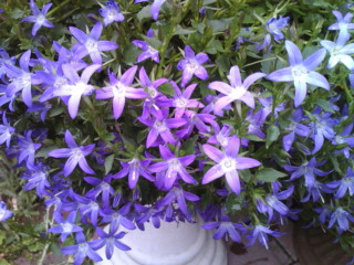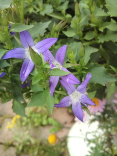 1枚目、カンパニュラ。2枚目、花びらの周りが白いオステオスペルマム。他の花は、3枚目のように、花びら全体が赤紫です。3枚目、普通のオステオスペルマム。4枚目、ラークスパー(千鳥草)まだ咲き始めです。