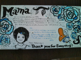 大学二年のマッキーと高2のミンミからもらった母の日カードです。バラや私のイラストはマッキーが描いてくれました!「まま~!!いつもありがとう大学生になって早一年。部活、サークル、バイト、、、それからホームスティ好き放題やらせてもらってます。おかげで毎日がSpecial!!ふわふわした生活(プチ家出ちっく?)してても、帰ってくる実家がいつも温かいから安心して旅できるんだよ。ママのおかげです。うん、ほんとに。体に気をつけて楽しい先生Lifeを送ってください"子供にナメられてる"じゃなく、"子供になつかれてる"と思え!」マッキー「ママへいつもグータラして、わがままいって迷惑かけてごめんなさい。今は今できることを精一杯できるように努力します!!いつも優しく見守ってくれてありがとう。生意気にもママを支えられればいいなって思ってるよ!いつもありがとう。」ミンミHappy Mother's day!!Thank you for Everything! THANK YOU!! MAMAI feel your love all time!