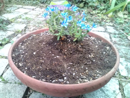 うちの花です。今日買った花もあります。前からあるイタリアンラベンダー・ブルーベリーラッフルズ。スピーシー・クロッカス。フランネルフラワー・エンジェルスター。プリムラ・マラコイデス。デルフィニウム・ミントブルー。深山蛍かずら。別名、リソドラ・ホワイトスター。やはり和名の方が覚えやすいし、風情があるなあ・・・青一色の深山蛍かずらもいいけど、白い星が入るもの素敵ですよね。つい青い花ばかり買ってしまう私だから、なおさら他の色も入らないと・・・