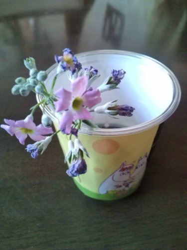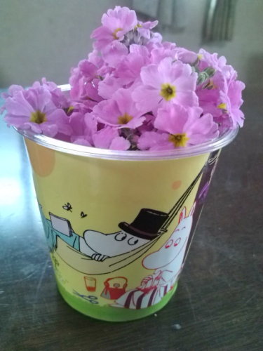 今日は風が強かったので、プリムラマラコイデスの鉢が倒れ、何本も茎が折れてしまいました。可哀想なので、ムーミンコップに挿しました。以前、ムーミンコップに挿してた菜の花は、ガラスの醤油入れを花瓶代わりにしました。この菜の花は食用なのですが、花が咲いてしまってたので、生けたのです。少しでも花が食卓にあると華やぎますよね。