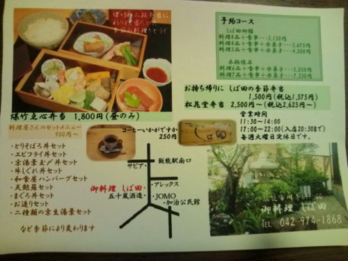 今日は、お昼休みに勤務校を離れ、学区外の懐石料理・しば田でランチしました。O先生の車に乗せてもらい、N先生と連れてってもらったのです。実は、昨日も学区外のフレンチ・イタリアンレストランボワサンでランチしたので、O先生がさっぱりしたものが食べたいと和食にしたのです。住宅街にある隠れ家風のお店で、二階は住宅のようです。私は、まぐろ丼セット(1200円)。 ごまあえで美味しかった。O先生は、豆乳入りの和食屋ハンバーグセット(1000円)。半熟卵が美味しそう。N先生は、牡蠣フライセット(1200円)です。みんな美味しそうでしたね。また、携帯を忘れてしまったので、撮れませんでしたが・・・代わりにちらしと名刺をもらってきました。今度、他の人を誘って、また行ってみようかな?御料理しば田 (懐石・会席料理 / 飯能駅、東飯能駅)昼総合点★★★☆☆ 3.0
