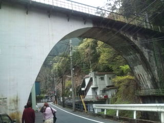 家族で鳩ノ巣渓谷を歩き、白丸ダムを通り、アースガーデンでランチをしてからまた歩いて、もえぎの湯に着きました。さすがGWでハイキング客が多い!ランチも待たされたけど、ここでも男湯は整理券・・・私と長女マッキー、次女ミンミの女性軍は一足先に入りました。主人と息子カズは待合室で?待つようです。足湯に入って待ったらと主人に言ったけど、もったいないらしい・・・ 室内の湯船はそれほど大きくないけど、露天風呂は広くて気持ちよかった。川原のテントが見えたけど、あっちからも見える?・・・出てからは、お休み処で休憩。私はマンゴーソフト。上を箸でつまんだら、巻いてあるのが伸びて付いてくる・・・マッキーは抹茶ソフト、少し交換しました。主人やカズ、ミンミもそれぞれ頼んでいろいろ食べてました。もえぎの湯でマッキーがうどを買いました。帰りにみかけた赤い鉄橋。もえぎの湯から奥多摩駅から歩き、鳩ノ巣駅まで電車に乗りました。 奥多摩駅の売店でわさびの花を売っていて、またマッキーが買いました。売店で少女が一生懸命説明してくれてるから、つい情にほだされてしまいますよね。鳩ノ巣駅近くの町営駐車場に車を置いてあるので、鳩ノ巣駅で下車。 鳩ノ巣駅前の売店で、またマッキーがわらびを買うという・・・もえぎの湯では、灰汁抜き済みのわらびが売っていたけど、ここのは灰汁抜いてないよと言ったら、灰汁抜き用の灰もくれるらしい。わらびの上に灰を撒いて、熱湯をかけて漬けておくのだそうです。今日はもう帰って外食だけど、明日はうどにわらびに山菜三昧かな?マッキーが作ってくれるというので楽しみです。鳩ノ巣駅から駐車場に降りる道には、風情のある塀のある家。