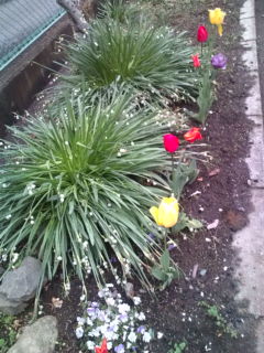勤務校の裏庭の花壇です。表の方がもっと華やかなのですが、駐車してる場所の近くなので、帰りがけに撮ってみました。チューリップやビオラ、白い花は度忘れしました・・・フォスデリィ・キングという赤いチューリップ。球根の袋を名札代わりに挿してくれてます。ビオラ。百合咲きの赤いチューリップ。紫の八重のチューリップ。豪華ですよね。思い出しました!スノーフレークです。検索したら、ゲームのキャラとか出てきたから違うかと思ったけど、合ってたようです。水仙。