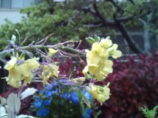 またまたまた?うちの花です。黄色いバラの蕾。紫花菜。花ニラとムスカリ。花ニラ。シラーの蕾。夢色パンジー。ビオラ。ネメシア。