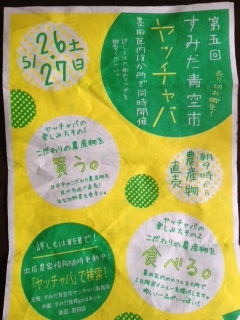 長女マッキーが、一昨日・昨日やってた「第5回すみだ青空市ヤッチャバ」に参加してきました。 下のイラストもマッキーが描きました。手伝ったところの、産地直送の野菜や卵、ハチミツ、ドレッシングなどもらったそうです。マッキーが赤玉で、玉子焼きを作ってくれました。何も味付けしなくても、ほのかに甘い。後から味を足しましたが・・・マッキーがイラストを描いたスタッフTシャツ。地図もイラストもマッキーがかきました。細かいところと回りは他の人ですが。描いたイラストを挿し込んでくれたらしい。結構使ってもらえましたね。実際の地図。チラシのイラストや文章も書いたのですよね。他に、名刺作りも頼まれたと言ってました。