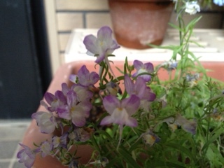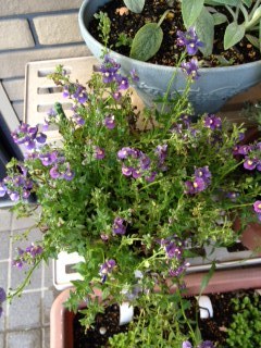 また・・・、うちの花です。こぼれダネから出てきたのですが、ネメシアかな?パンジー。手前の赤茶の花は、セリンセ・プライドオブジブラルタル。葉牡丹。白露草。バーベナ。ネメシア。最初のこぼれダネから出てきたネメシアより葉が小さいです。別のネメシアのこぼれダネかな?