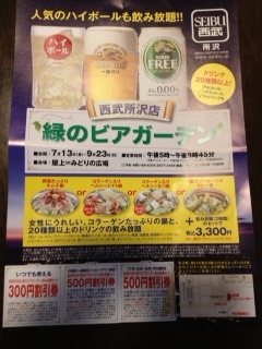 主人と所沢の西武デパートの屋上の緑のビアガーデンに行ってきました。5時からなので、まだ明るかったですね。飲み放題にしようか迷ったけど、そんなに飲めないから、単品ずつたのむことにしました。 主人は生ビール。私は、杏酒。ステージが出来ていて、ASSYという歌手が6時から歌うそう。コラーゲン玉入りモツ鍋。飲み放題にはしなかったけど、鍋は頼んでみました。夏なのに鍋なんて珍しいですよね。美味しかったけど、ちょっと味が濃い目。コラーゲン玉が溶ける前に少しそのまま食べておいてよかった。溶けてしまったら、汁を飲み干さないとコラーゲン取れないものね。定番の枝豆?喉が渇いてたので、空きっ腹に杏酒を一気に?飲んだら、酔っ払ってきたけど、すぐには分からず、赤ワインを頼んでしまった・・・トイレは屋上にはなく、8階までエレベーターで下がったけど、気分が悪くて、もう帰りたくなってしまった・・・でも屋上に帰ったら、風が気持ちよく、すこし回復。赤ワインは、半分も飲めずじまいでしたが・・・主人は、また生ビール。冷やしトマトも頼みました。6時過ぎに、Assyのステージが始まりました。主人は練馬で2年前に聞いたことがあったらしい。もう夕焼け空です。「透き通るような高音域と歌唱力。美しいクリスタルボイス」というキャッチコピー。上手かったけど、ここまでの表現は要らないかな・・・FMチャッピーでもポスター見たことあったと思ったら、パーソナリティもしてるんですね。ビアガーデンで毎日歌ってるのかと思ったら、たまたま今日だけのステージだったらしい。聞けてラッキーでしたね。ファンなのか、家族なのか、ペンライトを持って、応援してました。花束ももらっていた。ファンがおっかけてるんですね。p.s.Assyの歌もYoutubeに載せて、日記も書いたけど、遠くからで空席が目立つから削除してほしいとAssyのスタッフのメールが来たので削除しました。Youtube、日記、facebook、ツイッター、mixiと連携してるから、みんな削除しなくてはならず、面倒です・・・ビアガーデンの空席だから気にすることないと思うけどね。iphoneのビデオはズームできないので、後ろの席からそのまま撮ってたから、ステージまでの席が空席なのが分かってしまったのですよね。写真はズーム出来るのに、なぜ動画はズーム出来ないんでしょうね・・・