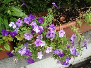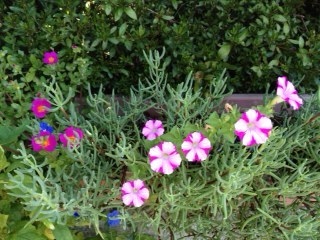 またまた、うちの花。 松葉牡丹。ペチュニア・ショックウエーブデニム。小輪ガーデンダリア。バッタが居ました。ヤブラン。ポーチュラカ。バーベナ。濃いピンクは、ペチュニア・マジックパープル。ピンクの筋は、ペチュニア・ほお紅。ペチュニア・舞桜。ポーチュラカ。