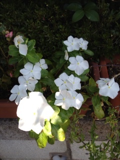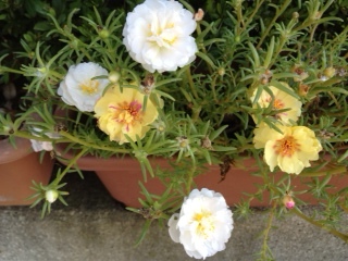 また、うちの花。ローズ・ミミエデン。鉄砲百合。西洋朝顔アーリーへブンリーブルー。西洋朝顔フライングソーサー。青と白が入り混じってます。かすかに赤も?八重ポーチュラカ。白は、八重ポーチュラカ。ピンクに筋は、ペチュニア・ほお紅。斑入り葉ポーチュラカ。