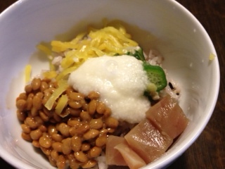 今夜の夕食は、ばくだん丼。マグロ・納豆・オクラ、沢庵、とろろをかけてます。ブロッコリー。具沢山味噌汁。鶏・白菜・玉ねぎ、人参、えのきが入ってます。今日は久しぶりに主人と晩酌。主人はビール、私は梅酒です。義母が夕食を食べに来ない木・金曜日しか飲めないのです。撮り忘れたけど、冷奴をおつまみにしました。主人は、もずく酢も。