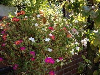 また、うちの花。紫は、バーベナ。オレンジは、ポーチュラカ。マリーゴールド。ビンカ・ラッキースター。ペチュニア・ショックウエーブデニム。松葉牡丹。萩。青は、アメリカンブルー。ピンクは、ポーチュラカ。松葉牡丹。