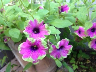 またまた、うちの花。ペチュニア・ピカソ。切り戻したけど、また咲いてきました。チコリ。切り戻したペチュニアを花瓶?に生けました。実は醤油さしです・・・白黒は、ブラックペチュニア・ピンストライプ。ピンクに筋は、ペチュニア・ほお紅。ピンクに緑はペチュニア・ピカソ。濃いピンクは、ペチュニア・マジックパープル。後ろの葉は、小輪ガーデンダリア。なぜかプランターのダリアが枯れてきたので、慌てて挿し芽用に切りました。