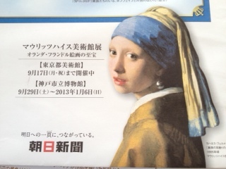 朝日新聞でマウリッツハイス美術館展をやってるので、先月から毎月、その中の代表的な絵を額絵で配布してくれてます。ファイルも買って、綴じ込んでます。この展覧会も先日観に行ったので、ますます興味深いかな。上野の東京都美術館で9月17日までやってるけど、閉館時間を延長するほど、混んでるそうです。早く大好きな「真珠の耳飾りの少女」が欲しいけど、第7回目の配布ですね・・・第二回の今月は、この2枚。「狩りに向かう貴族たちにいる、ホフフェイフェル池のほとり」ヘリット・ベルクヘイデ作。解説の写真、字が小さいけど読めますか?「ヴァイオリン弾き」(ヘリット・ファン・ホンホルスト作)。
