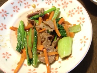 夕食は、肉野菜炒め。ビビンバ丼のはずが面倒で一緒に炒めてしまった。モヤシと大根葉のごま油いため。アスパラガスのレンジ蒸し。サラダ。イカ団子とニラ、ビーフンの中華スープ。山形ガールズ農場の赤米入りご飯。梨。