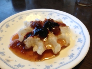 おやつにモッフル。お餅のワッフルです。 さくらんぼジャムをのせて食べたら美味しかった。 長女マッキーが、以前住んでたシェアハウスからモッフルの器械を借りてきたので、作ってみました。茹で栗。これもマッキーが滋賀の春日からもらってきた栗。ほんのり自然な甘さが優しい感じ。