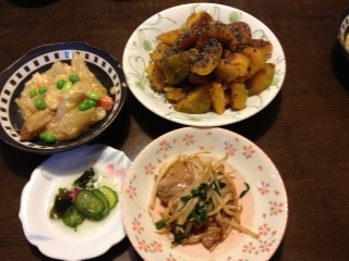 夕食は、長女マッキーが作ってくれました。肉野菜炒め、大根などの卵とじ、胡瓜とワカメの酢の物。 かぼちゃとサツマイモの煮物、さつまいもと玉ねぎの味噌汁、柿。 ランチの残りのナンも食べました。ランチの時間が遅かったから、あまり食べられなかったけどね。