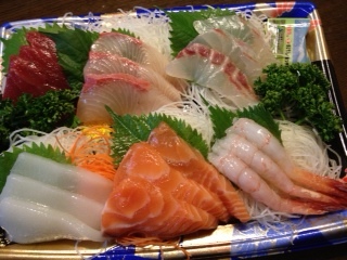 夕食は、刺身。鮭と玉ねぎ・ブロッコリーのクリーム煮。白菜の味噌汁。下田茄子の浅漬け。里芋の煮物。素麺カボチャのゴマだれ和え。