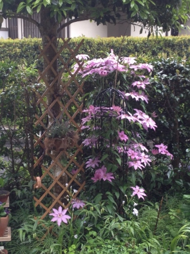クレマチス・パテンス系ビオレット。オベリスクや、ラティスに絡ませてます。生け垣にも絡んで越えていってますが・・・トレリスにも絡ませてます。これは良く伸びて、よく咲いてくれるのですが、一斉に開花するので、一斉に終わってしまうのですよね・・・手前はシャガ。クレマチス・ビビアンペンニール。オキザリス。カラスノエンドウ。野草でもかわいいのは抜かずに取っておいてます。まあ、草むしりが面倒というのもあるけど。オオイヌノフグリ。オキザリス。この種類は無くなってしまったと思ったけど、まだ残っててうれしい。シラー。香りフロックス。