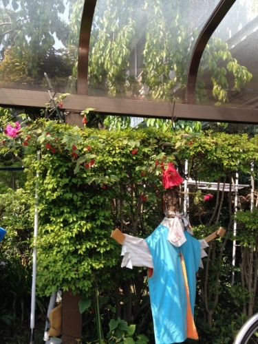 Kさん宅のお花です。チロリアンランプ。ガレージの下に絡ませてます。ピノキオのかかしも一緒に。チロリアンランプを挿し芽で増やした鉢をいただきました。クリスマスローズ。つる日日草。立浪草。うちのはまだ咲いてませんね。シャガ、ビオラ。弁慶草?桜。剪定するのに、次はクレーンが必要と植木屋さんに言われたそうです・・・桜の下で、半日蔭になってるけど、木漏れ日がさわやかですね。奥のオレンジは、君子蘭。白山吹。
