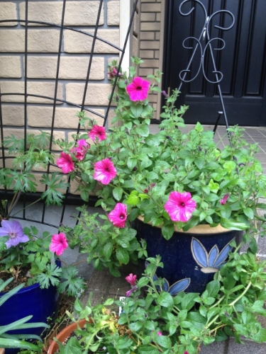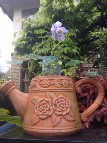 深山苧環(みやまおだまき)も咲きだしました。如雨露型の鉢に植えてます。ツルハナシノブ・シアウッドパープル。デルフィニウム・ミントブルー。立浪草。左はロベリア、右はペンステモン。蕾が出てきました。ロベリア。クレマチス・デニーズダブル。ようやく色づいてきました。八重なのですが、ガクも花びらになるのかな。
