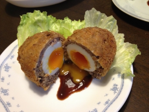 信州中野旅行から帰ってきて疲れてたので、長女マッキーが夕食を作ってくれたのは助かりました!以前から「ごちそうさん」のレシピでスコッチエッグを作りたいとマッキーは言ってたのですが、どうせなら旅行から帰ってくる今日作ってと私が言ったのです。それにマッキーも昨日がカフェスロー勤務最終日で、明日から新潟の粟島や近畿旅行に行ってしまうしね。カフェスローから独立して新しいお店を開く夫婦の手伝いに粟島へ2週間行き、その後大阪でライブを聴き、滋賀・京都を回るのです。話は戻りますが、ごちそうさんレシピのラグビーボール型スコッチエッグです。卵がレシピ通り半熟で感激!美味しかったです。マッキーが買った「ごちそうさん」レシピブックの写真に似てるかな?家族勢揃いというので、つい東南アジア旅行に行ってる次女ミンミの分も含めて6個作ってしまったらしい。あと、白和えと菊芋甘辛煮も作ってくれました。 白和え。ほうれんそう、いんげん、3色パプリカ、胡麻入り。菊芋に米粉を付けて揚げてから、甘辛く煮たそうです。ひじきとアオサの味噌汁。