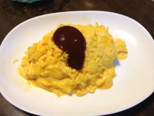 夕食は、オムライス。チキンライスは炊き込こんでしまいました。ケチャップとソースを混ぜて、デミグラスソース風?煮込みハンバーグ。南瓜・しめじ・ブロッコリーと。餃子スープ。椎茸・分葱入りです。サラダ。