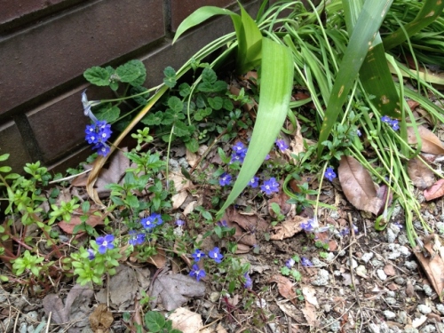 ベロニカ・オックスフォードブルー。ロックガーデンのような雰囲気ですよね。ローダンセマム。ベロニカ・マダムマルシア。ハーブゼラニウム・ナツメグゴールデン。クレマチス・ハーバードジョンソン。黄色はモッコウバラ。水色は忘れな草。クレマチス・カルトマニージョー。海老根。Kさんから以前いただいたものです。
