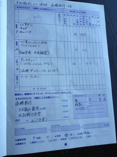 ダイエット食事日記29日目です。 今日から二泊三日の函館旅行。義母と主人と3人で行きます。朝食は、しらす干し、糠漬けなどですが、ランチに羽田空港の赤坂離宮でつぶ貝にんにく炒め、夕食に函館のザ・ベリー・ベリー・ビーストでタンシチューと高カロリー・・・体重を量るのが怖かったけど、54.6kgと太ったものの、なんとか54kg台をキープ。明日も朝食バイキング、海鮮丼、旅館の夕食と続くから、ダイエットには不向きなのだけど、旅行中は美味しいものを食べたいよね。太った分は後で減らそう・・・