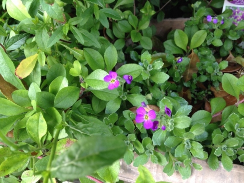 ツルニチニチソウ。黄色い葉もあります。松葉菊。下には、アイビーも。オベリスクには、クレマチス・パテンス系ビオレットの種。背の高い葉は鉄砲百合。ベランダにハンギングしてるアサリナ。昨年買った苗が冬越ししました。なぜか今頃紅葉?メキシコ万年草?黄色いバラ。紫花菜。ゲラニウム・ファエウムブルー。冬越ししたけど、咲くかな?周りの菫に負けそう・・・