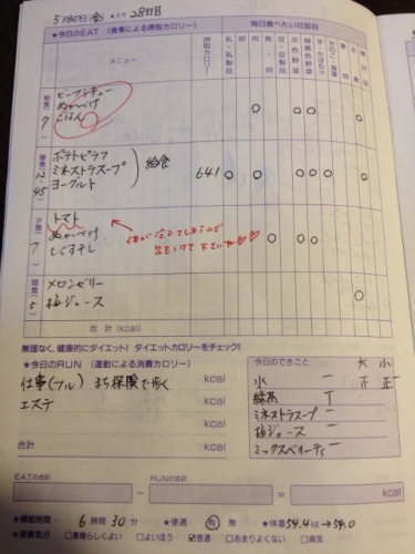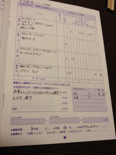 ダイエット食事日記24日目です。朝食は、ローストビーフ、糠漬け、大根の漬物など。糠漬けは、すいかや新玉ねぎ、えのきなどいろいろ試してます。今日は、声楽のレッスンで5月15日の教会での父の日コンサートで歌う曲を練習しました。「ゴンドラの唄」と「宵待ち草」です。「春よ、来い」も歌うけど、これは声楽ではないしね。T先生とおしゃべりもはずんでしまい、昼食もとらずにエステに直行。T先生が心配して、音大の先生が作ったというのど飴を一粒くれたので、なめながら行きました。エステでマッサージなどしてもらった後、採寸してもらいました。5/3、11、26と採寸してます。体重は、59.4kg→57.1kg→55.3kg採寸のデータの写真ですが見えますか?お腹周りが一番減ってますね。へそ90cm→87cm→84cmメタボから脱出できたかな?ふくらはぎは、38cm→37cm→36.5cm気になる二の腕も測って欲しいですね。体脂肪率が33.2%→32.2%。内臓脂肪が65→60。体脂肪量が19.0kg→17.8kg体重だけでなく脂肪も落ちて、筋肉の割合が増えている。私の夕食は、スリムウィークスープ(カレー)とチーズチキン2切れ。主人と義母の夕食には、糠漬けやチーズチキンの他、ほうれん草ともやしのおかか和え。餅、油揚げ、もやし入り味噌汁。私も明日の朝食で食べたいですね。 間食に、グレープフルーツゼリーやプリン、チョコなど食べてしまったから、入浴前に量ったら、56.6kgになっていた・・・また、控えないとね。明日は初任者研修代理だから給食。子ども用でカロリー多いから、少量にしないとなあ。昨日、パステル音楽館のチャリティコンサート練習があり、オリジナルオペレッタでダイエットをしてる女性役をやったのですが、美貌アップ?の為のダイエットなので、ベルトでウエストマークするようにとの指示・・・ウエストのくびれを九月始めにコンサート当日までに作らないと・・・今までチュニック等でごまかしてばかりいたから、そんな服も無いなあ・・・