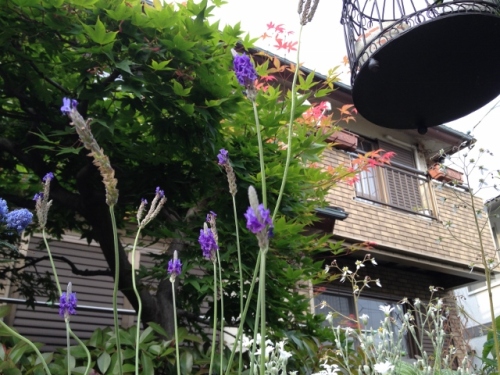 レースラベンダー。サルビア・コスミックブルー。セラスチューム・シルバーカーペット。雪ノ下。ノースポール、ビオラ。白妙菊。斑入りのホウチャクソウの実。左は酔芙蓉。紫陽花・八重深山紫。松葉菊。