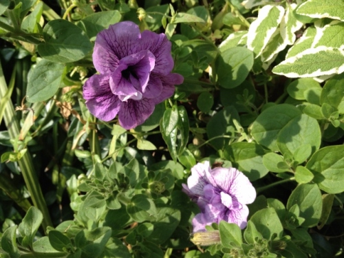ペチュニア・マジックパープル。ペチュニア。紫陽花・八重深山紫。松葉菊。ヒューケラ。酔芙蓉。紫陽花。ローズ・スーブニールDr.ジャーメイン。オキザリス。三つ葉。
