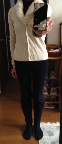 今日は、風呂場の大掃除でカビ取りするので、漂白しても大丈夫な白を着ました。でも実際にやるときは、その上にパジャマを着てしまいましたが。黒タートル、白ファー付カーディガン、黒パンツ、黒靴下。バーガンディのライトダウン、黒裏ボアロングブーツも。