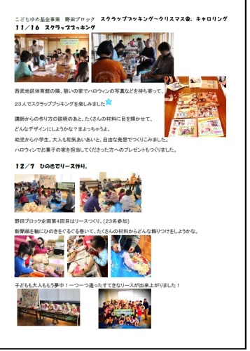 入間おやこ劇場野田ブロックのこどもゆめ基金事業の報告を作成。ハロウィンもあったけど、それは月刊誌「シェイク」にもう載せたから省略。スクラップブッキング、ひのきリース作り、一昨日のクリスマス会・キャロリング。早くメールで送らないと来月号のシェイクの締め切りに間に合わないからね。